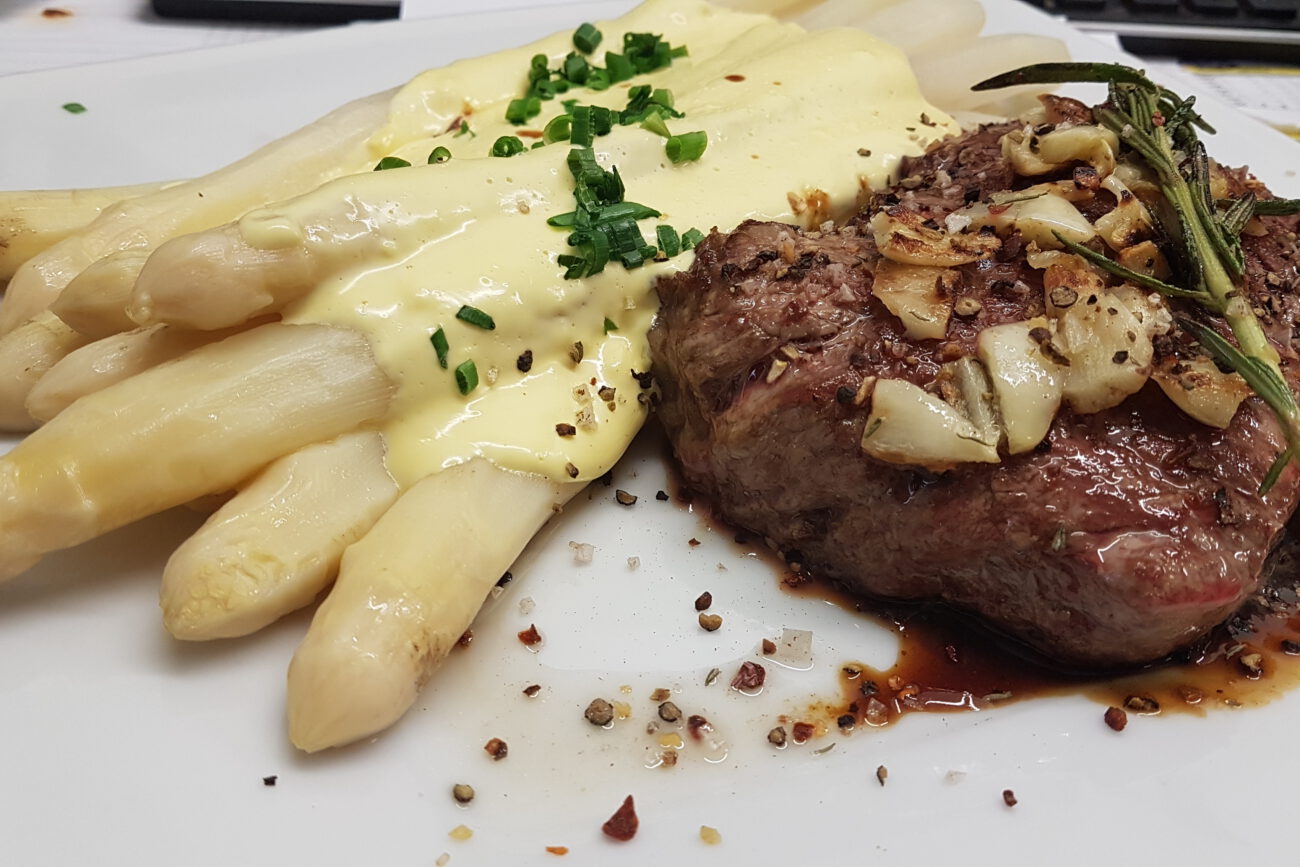 Ein kleiner Einkaufstipp: Für ein klassisches Spargelessen kalkuliert man 500 g Rohware pro Person.